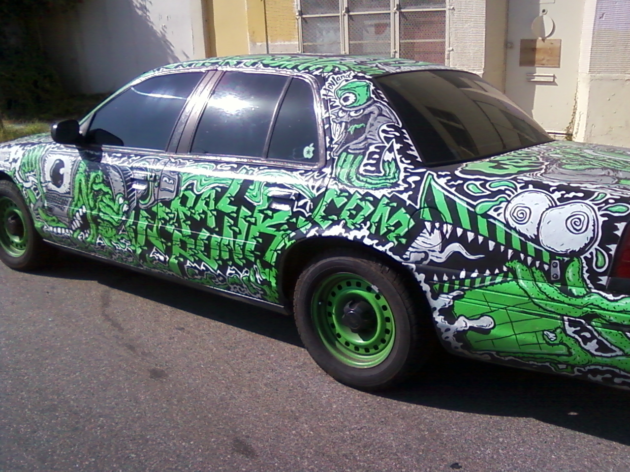 I recently saw this car as I was driving down Jefferson and I had to stop, get out and snap a photo with my phone. I never do this. That’s how awesome I think this car is. I’m not crazy about the green and silver combination of colors, but considering it’s a car I can’t blame the owner for choosing not-too-alarming colors. Actually, I love green. What I like most about the car’s design is that it covers the entire body of the car, even the inside metal of the tires are green. It’s graffiti-inspired and conjures up gritty thoughts of sewers, boogeymen, monsters and goblins. I like that it’s grimy and feels like it might be the getaway car of a villain, possibly the Green Goblin.