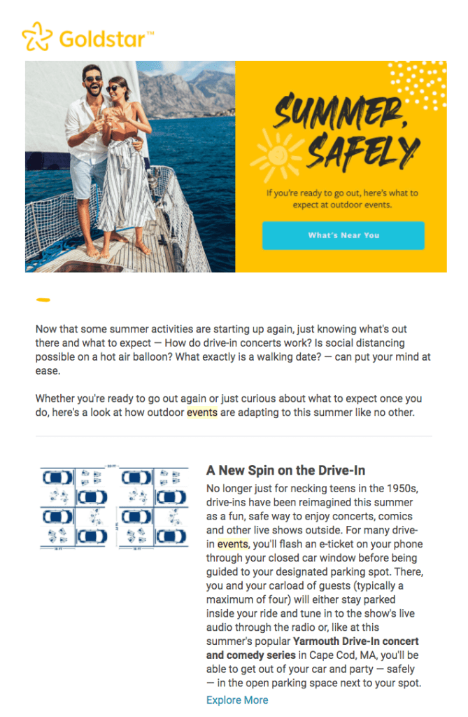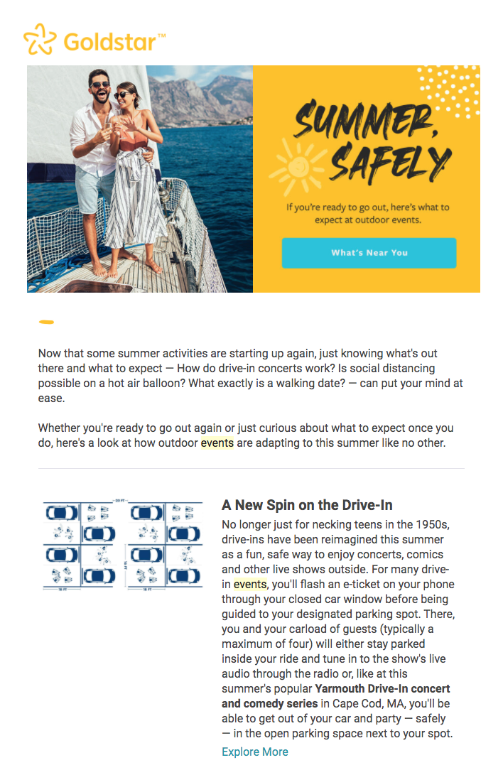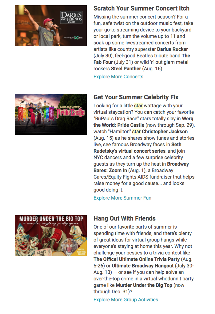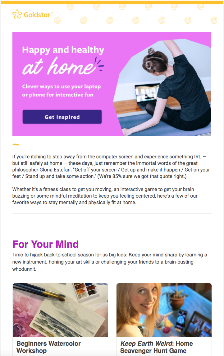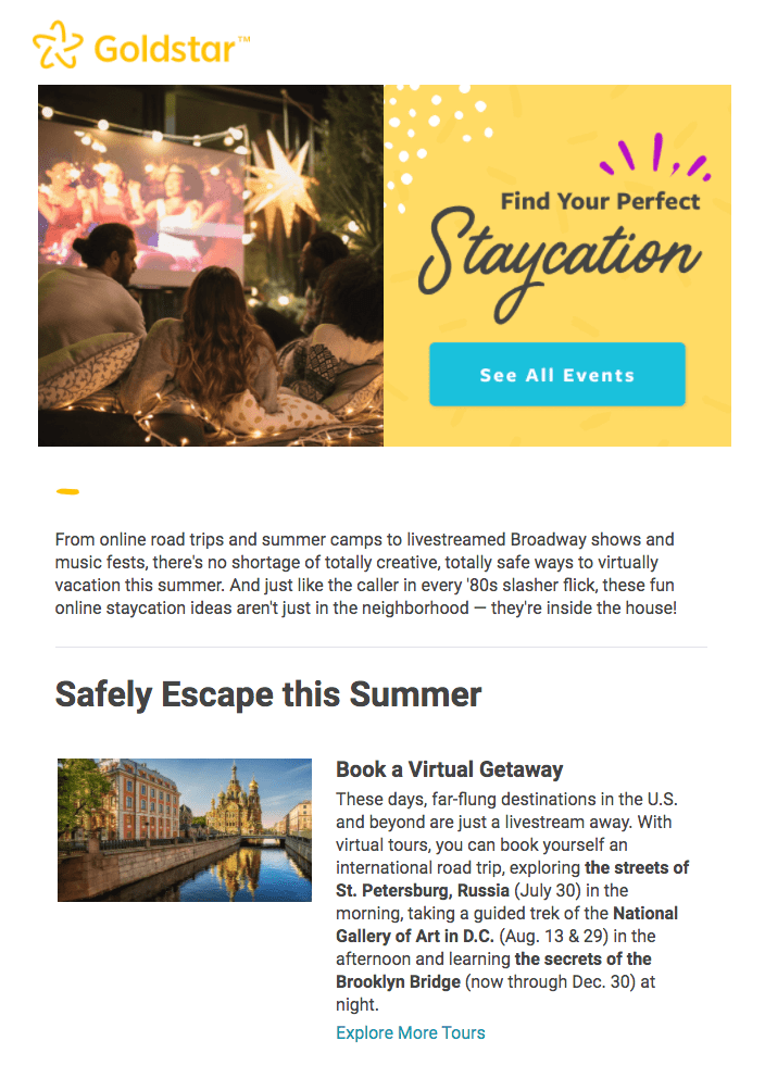 At Goldstar, we help our members find tickets to live entertainment. Post-pandemic, our editorial team was tasked with figuring out how to provide entertainment and fun for our members, without them going out, or with them going out safely. Below are a series of emails, which link to our consumer blog.