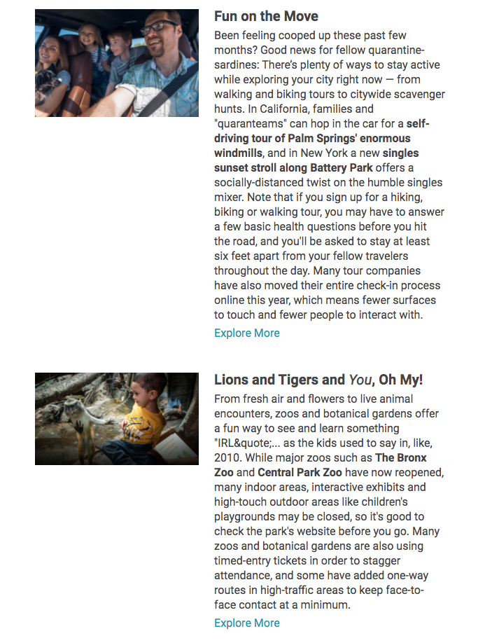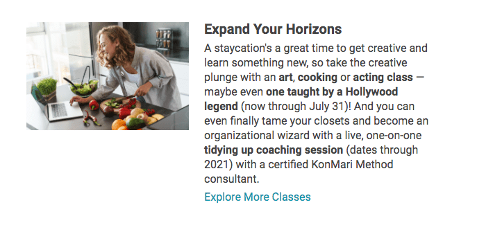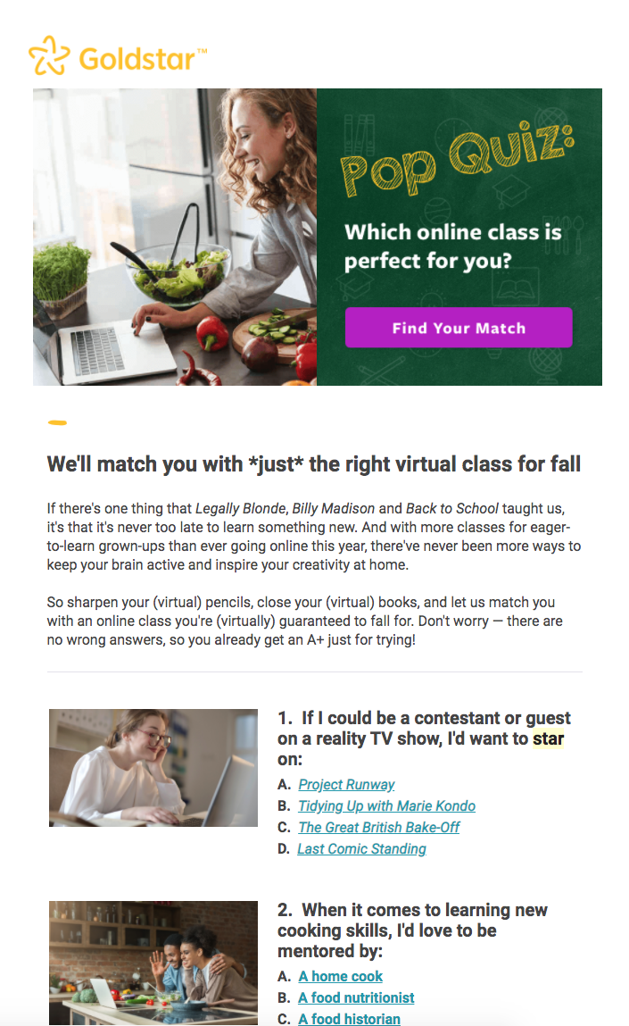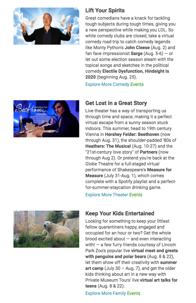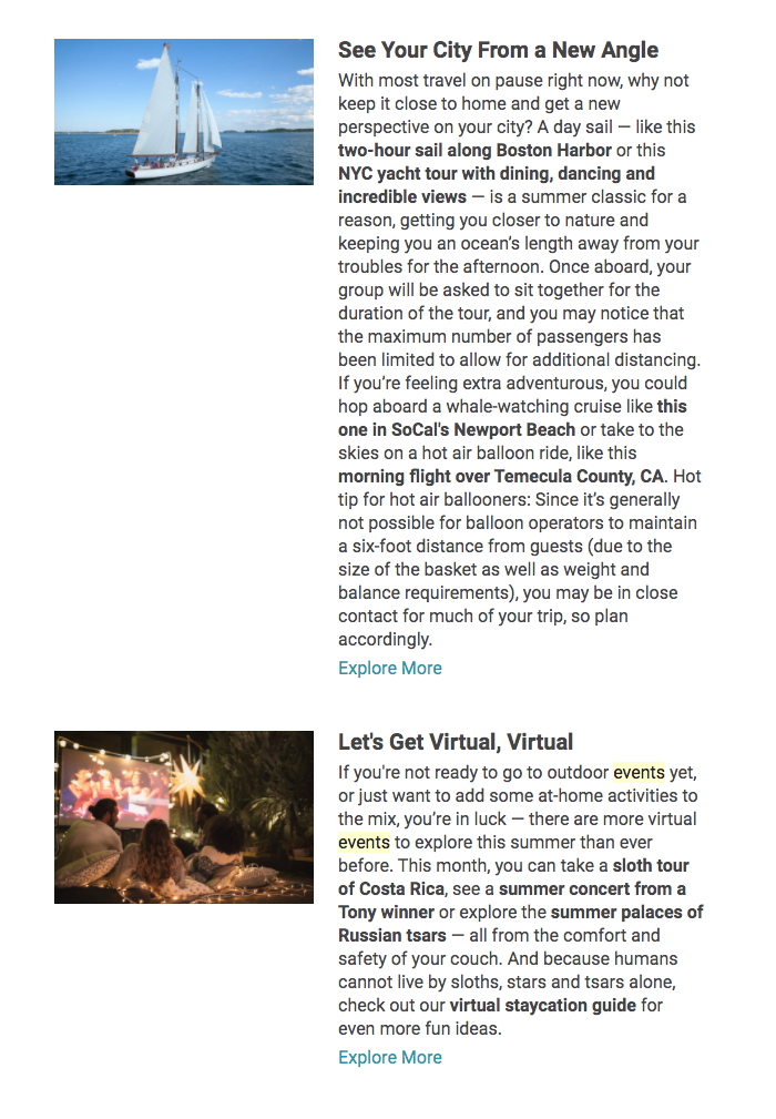 At Goldstar, we help our members find tickets to live entertainment. Post-pandemic, our editorial team was tasked with figuring out how to provide entertainment and fun for our members, without them going out, or with them going out safely. Below are a series of emails, which link to our consumer blog.